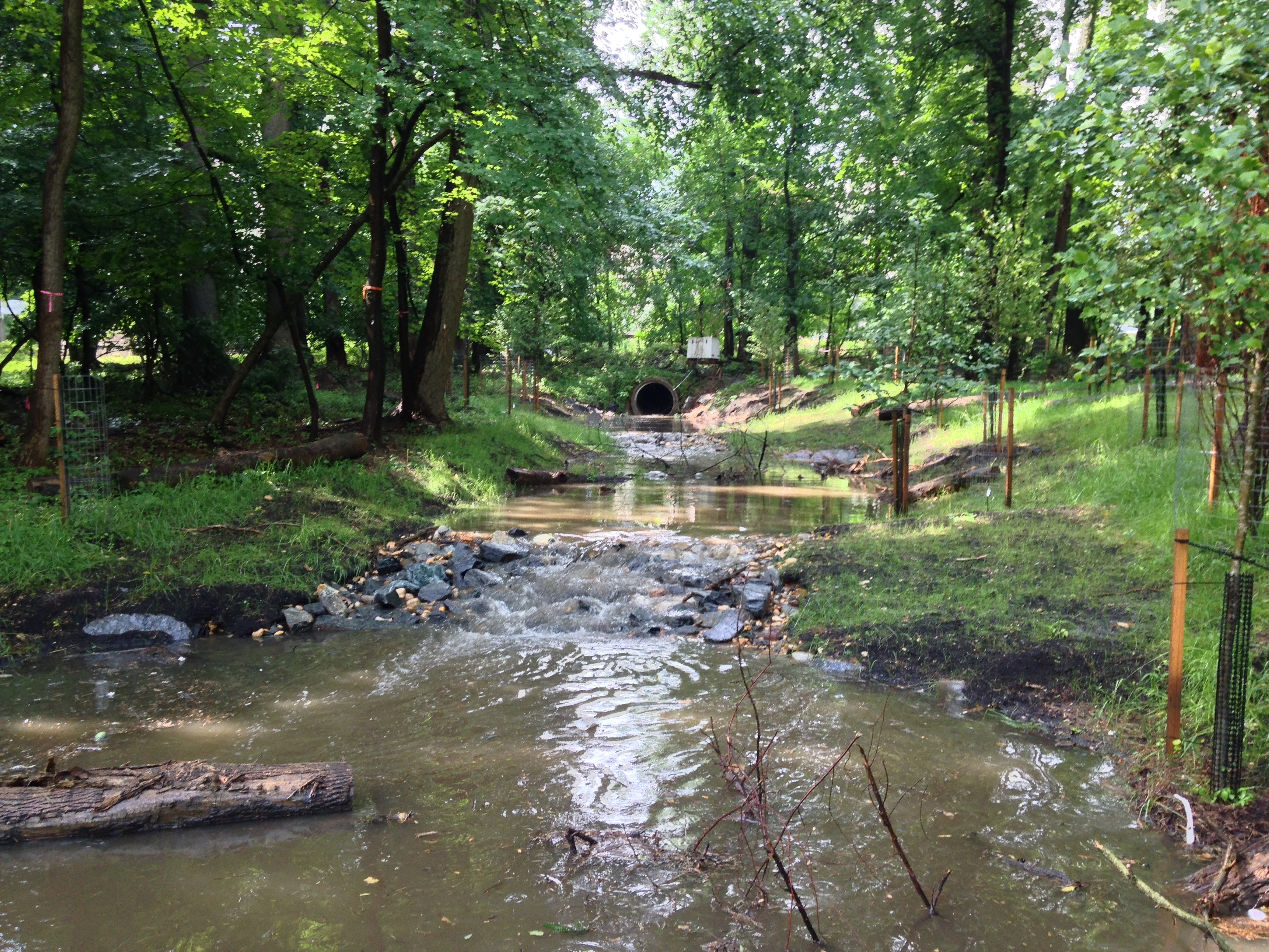 The Breewood stream restoration project followed a design approach referred to as Regenerative Storm Conveyance (RSC). The idea behind this approach is to promote the seepage of stormwater into and through a porous substrate comprised of soil, sand and wood chips. Through this process, pollutants are able to be filtered out. A series of pools and riffles were also created to improve aquatic habitat.