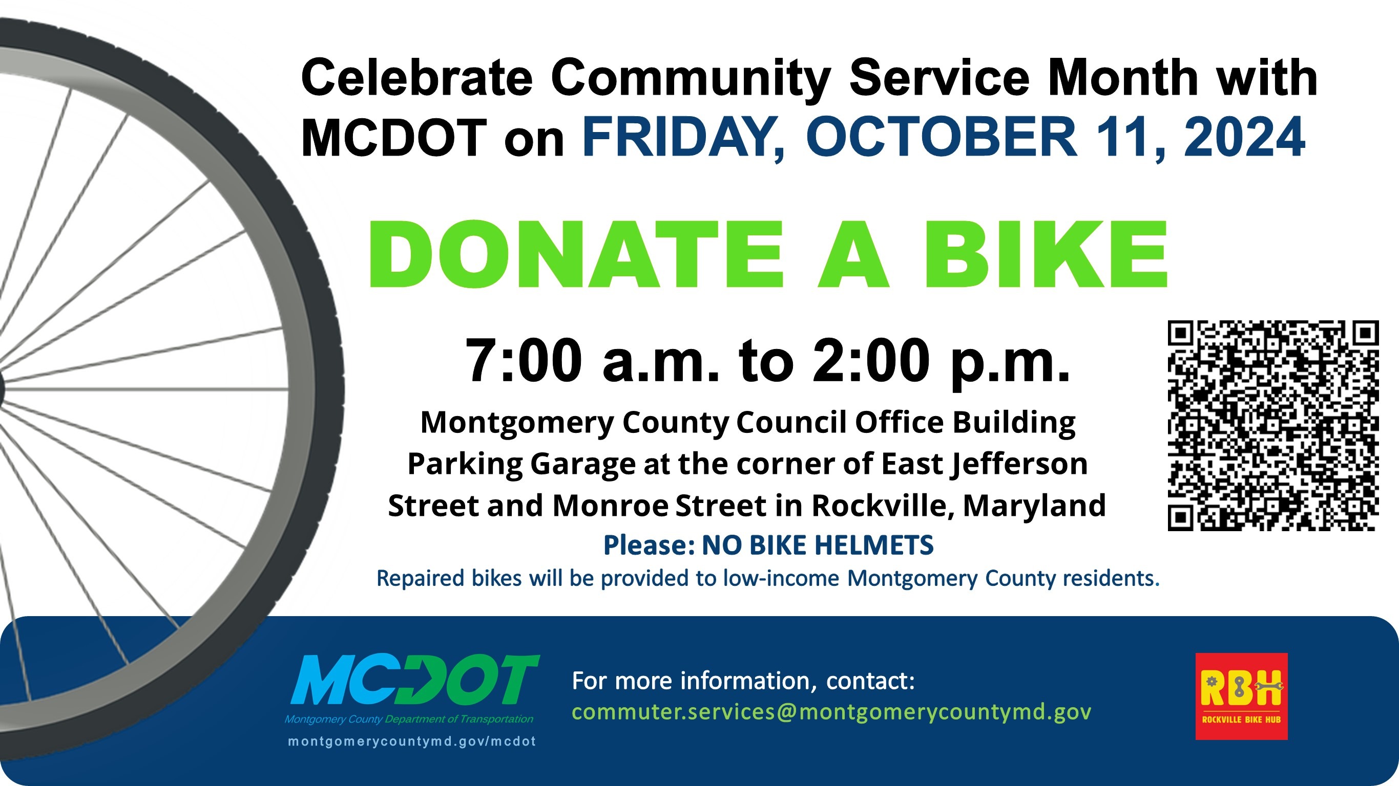 How? Donate it at the Montgomery County Department of Transportation’s annual Bicycle Donation Drive on Friday, October 11, 2024!