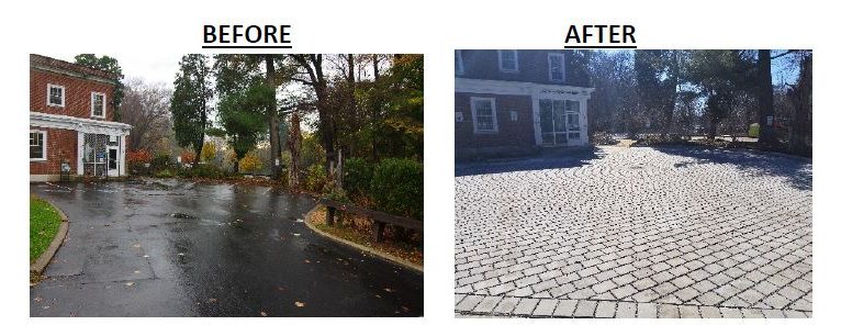 Before and after the installation of permeable pavers at Woodend Nature Sanctuary store parking lot.
