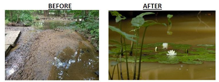 Before and after images of Woodend Nature Sanctuary, showcasing a walking path after invasive plants were removed and a pond after it was restored.